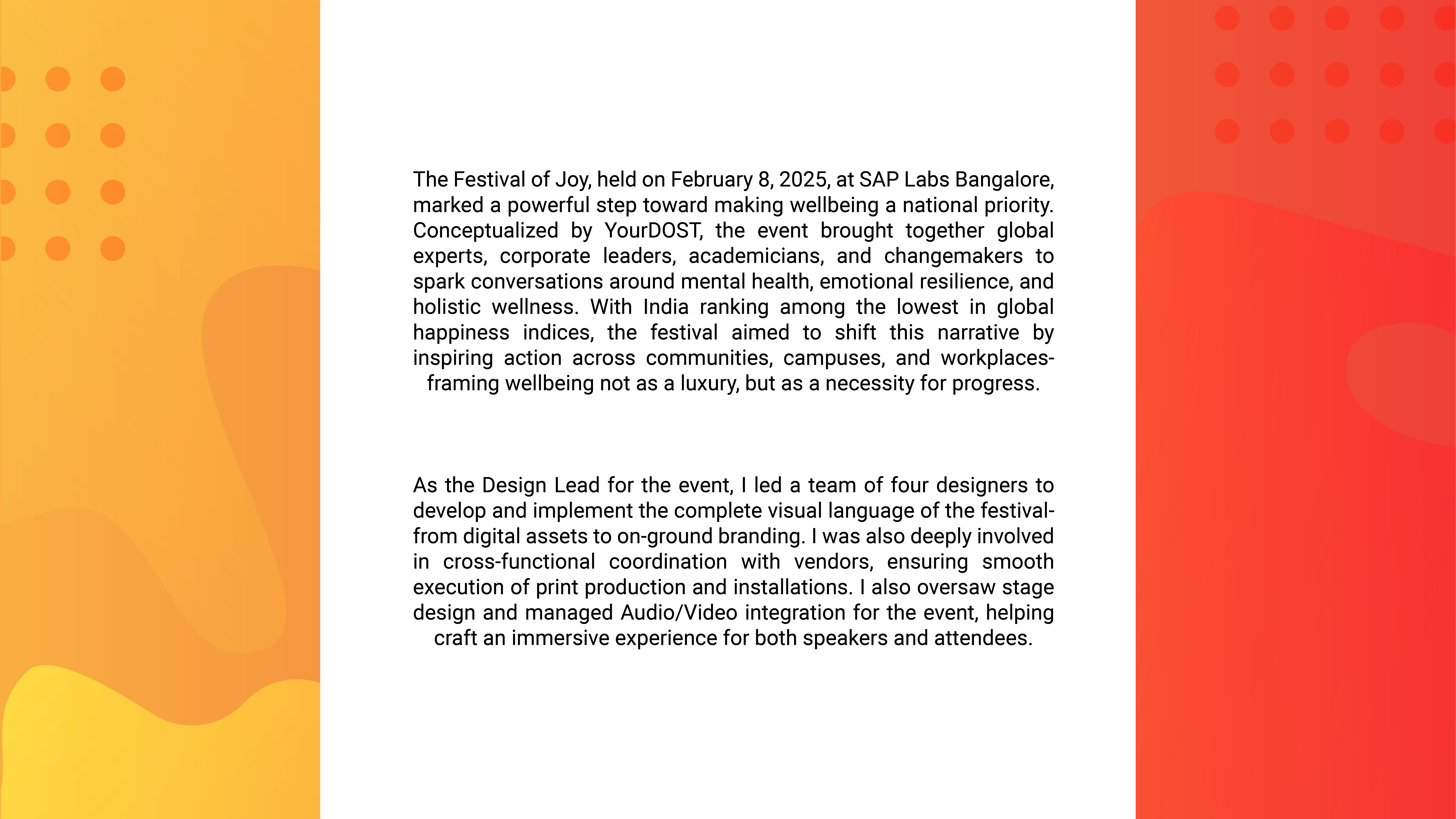 The inaugural edition of The Festival of Joy was held on February 8, 2025 at SAP Labs Bangalore.