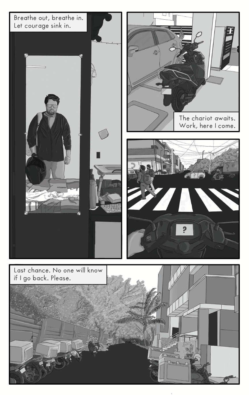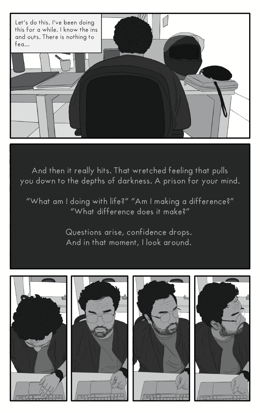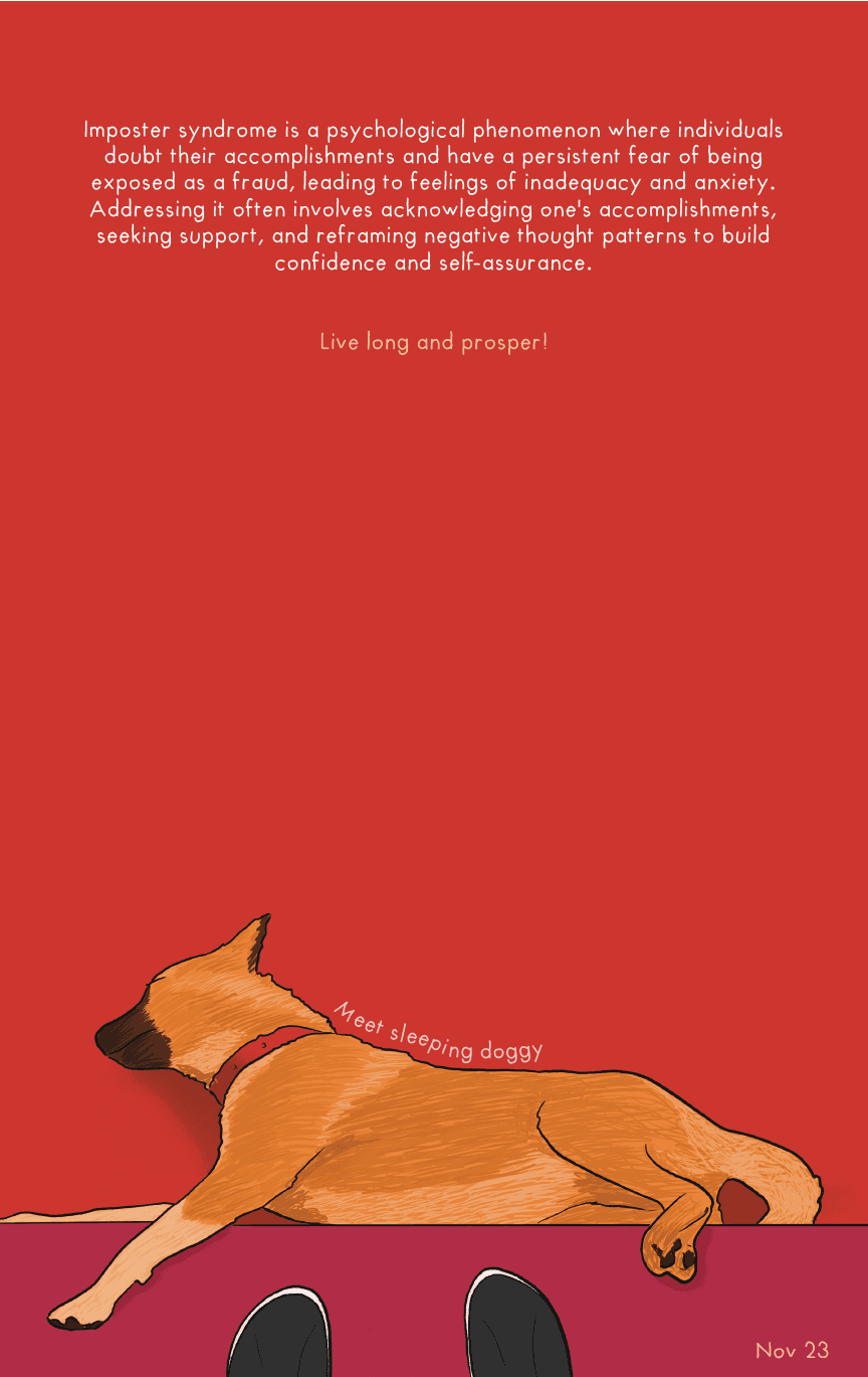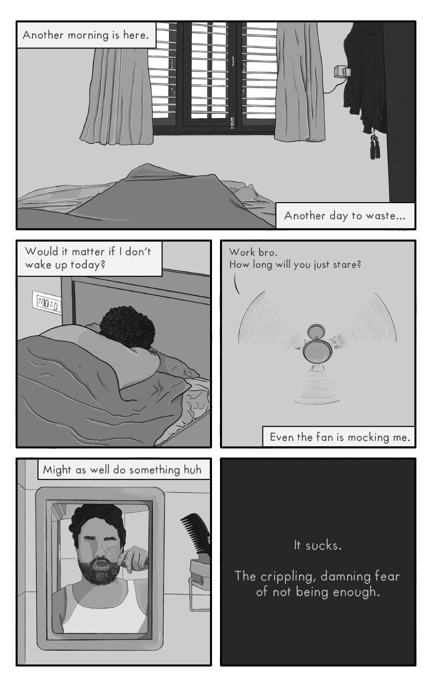 This comic speaks about imposter syndrome, something most people struggle with within themselves. I made this comic as a way to start a conversation, and as a space to vent out my feelings and inner thoughts.